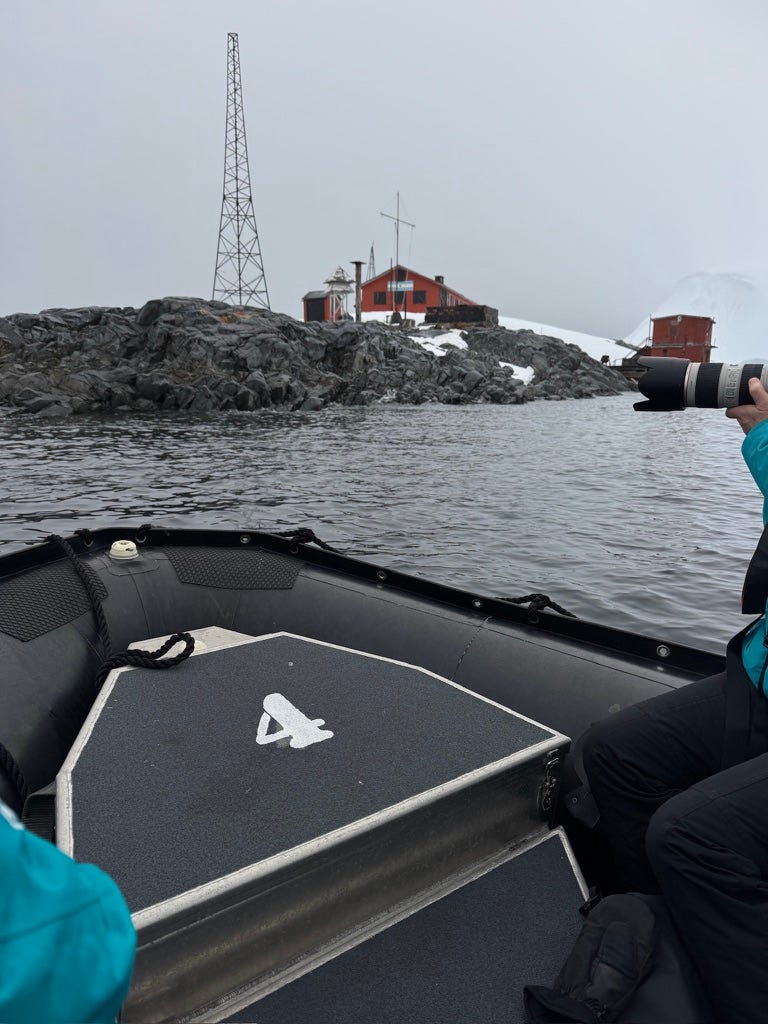For a few minutes, everything was movement and noise. The engine buzzing. Cold air against exposed skin. Water slapping against the inflatable hull. People pointing at everything - Melchior Base research station with its red paint, a fur seal sitting upright on a boulder like it owned the place, glacier faces glowing pale blue against a hazy grey sky. Everyone had a camera out. Everyone was looking.