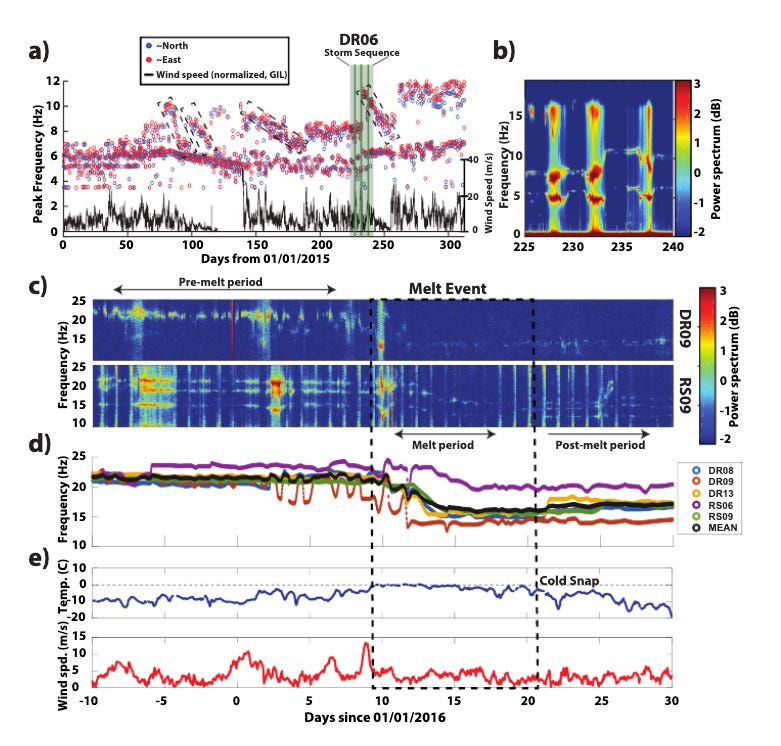 This is where the singing becomes more than a curiosity. Chaput’s discovery means we can monitor the firn layer’s health continuously, passively, from seismic stations that cost a fraction of satellite missions and aren’t limited by orbital passes or cloud cover. Changes to the hum - shifts in frequency, amplitude, spectral pattern - can tell us whether melt ponds or cracks are forming before they become visible from space. A tool to monitor the environment and its impact on the ice shelf. (At this point, I’m thinking that this data would be perfect for machine learning systems to uncover hidden correlations/insights.)