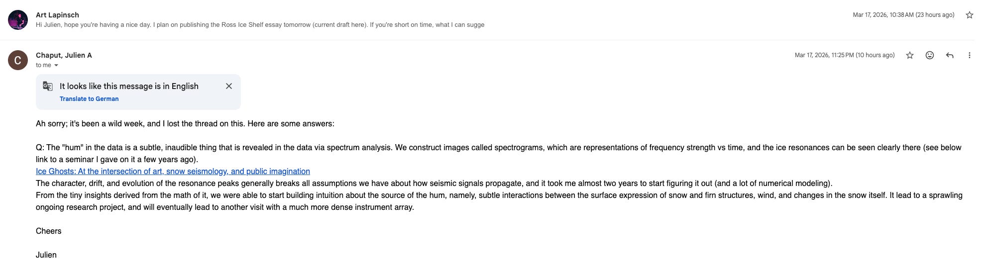 Julien: The “hum” in the data is a subtle, inaudible thing that is revealed in the data via spectrum analysis. We construct images called spectrograms, which are representations of frequency strength vs time, and the ice resonances can be seen clearly there (see below link to a seminar I gave on it a few years ago).