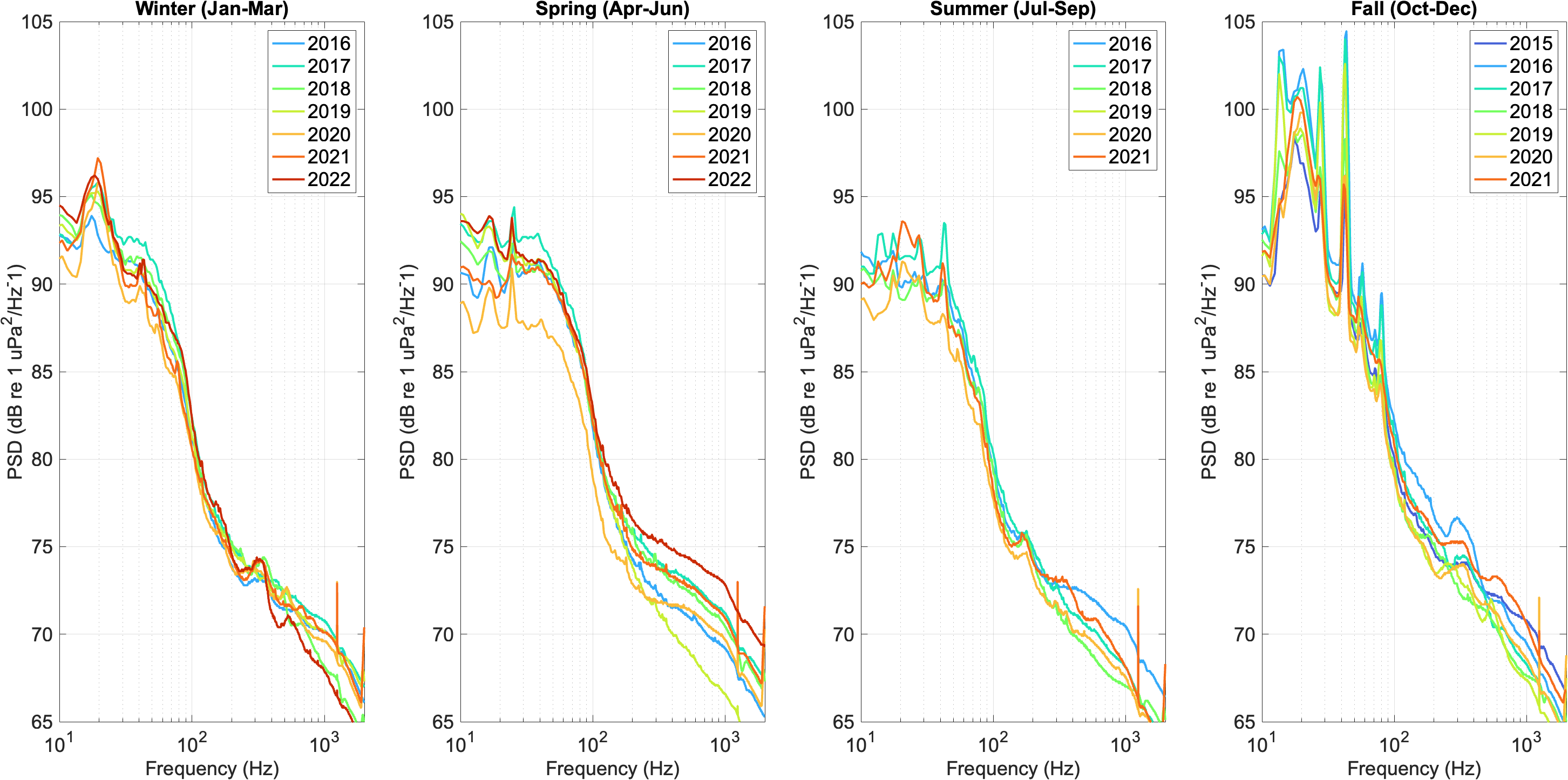 Deployed starting in 2014, these stations record continuously in the 10–2,000 Hz band, capturing anthropogenic noise (shipping, drilling), biological signals (whale calls, fish choruses), and geophysical sounds (storms, ice).