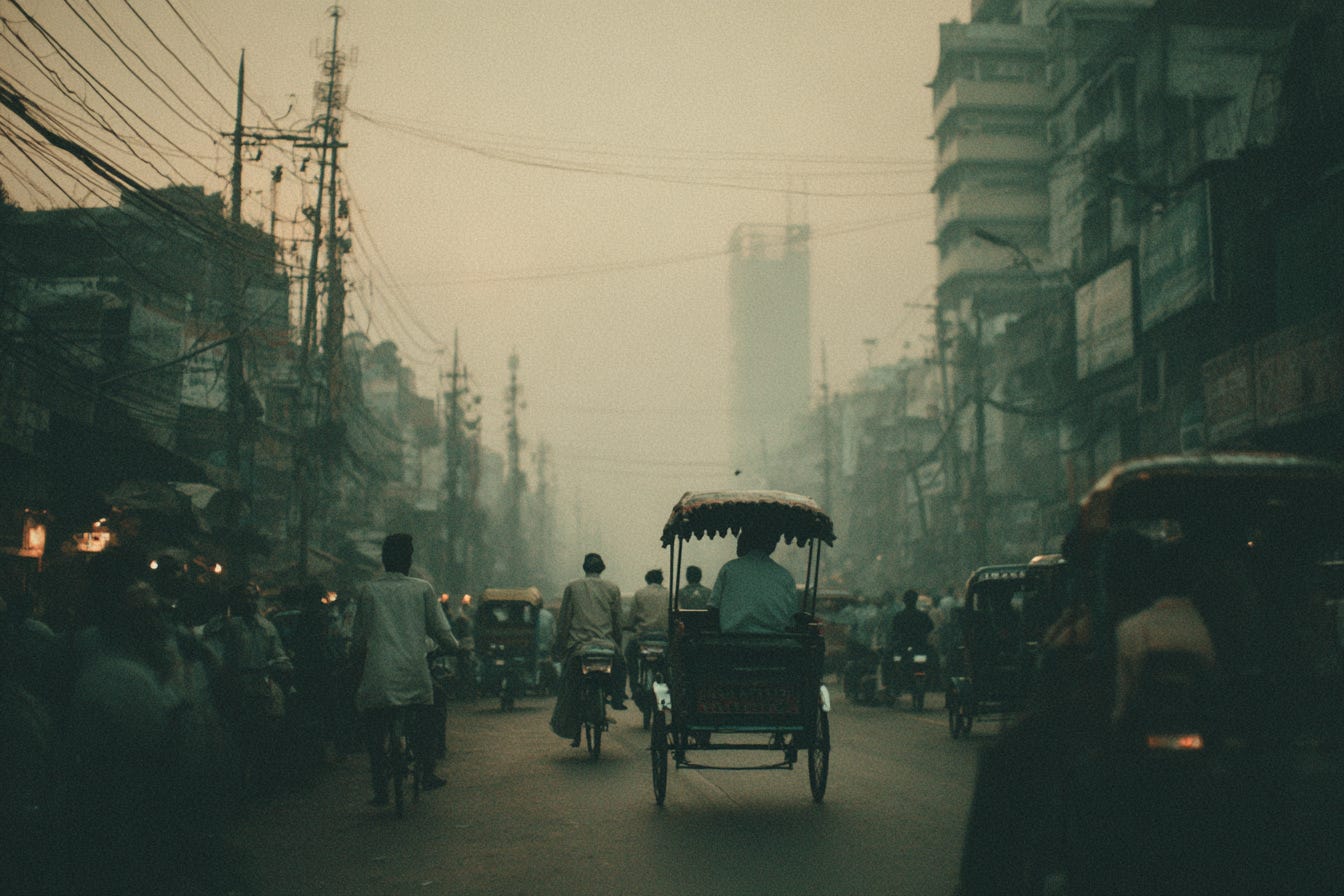 I took a rickshaw through the old city. The driver, a man in his fifties, glanced up through the windshield at the flat white dome above us.